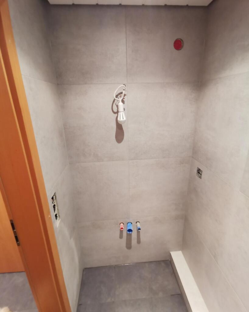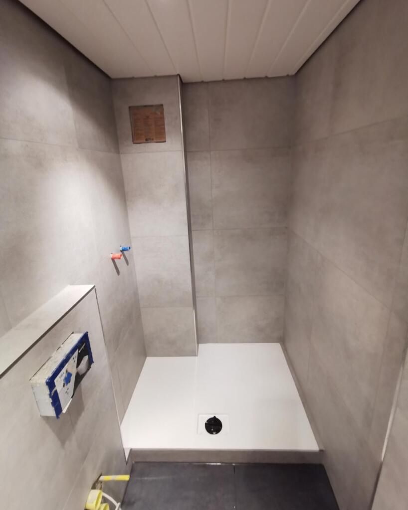60x60cm große Betonoptik Fliesen in Dusche und Flur Bodenbereich. Die Dusche war herausfordernd, aufgrund den begrenzten Platzverhältnissen. Dennoch konnten wir die Umsetzung einer sehr flachen Duschwanne in Kombination Waschbecken und WC mit Großforamtigen Fliesen realisieren.