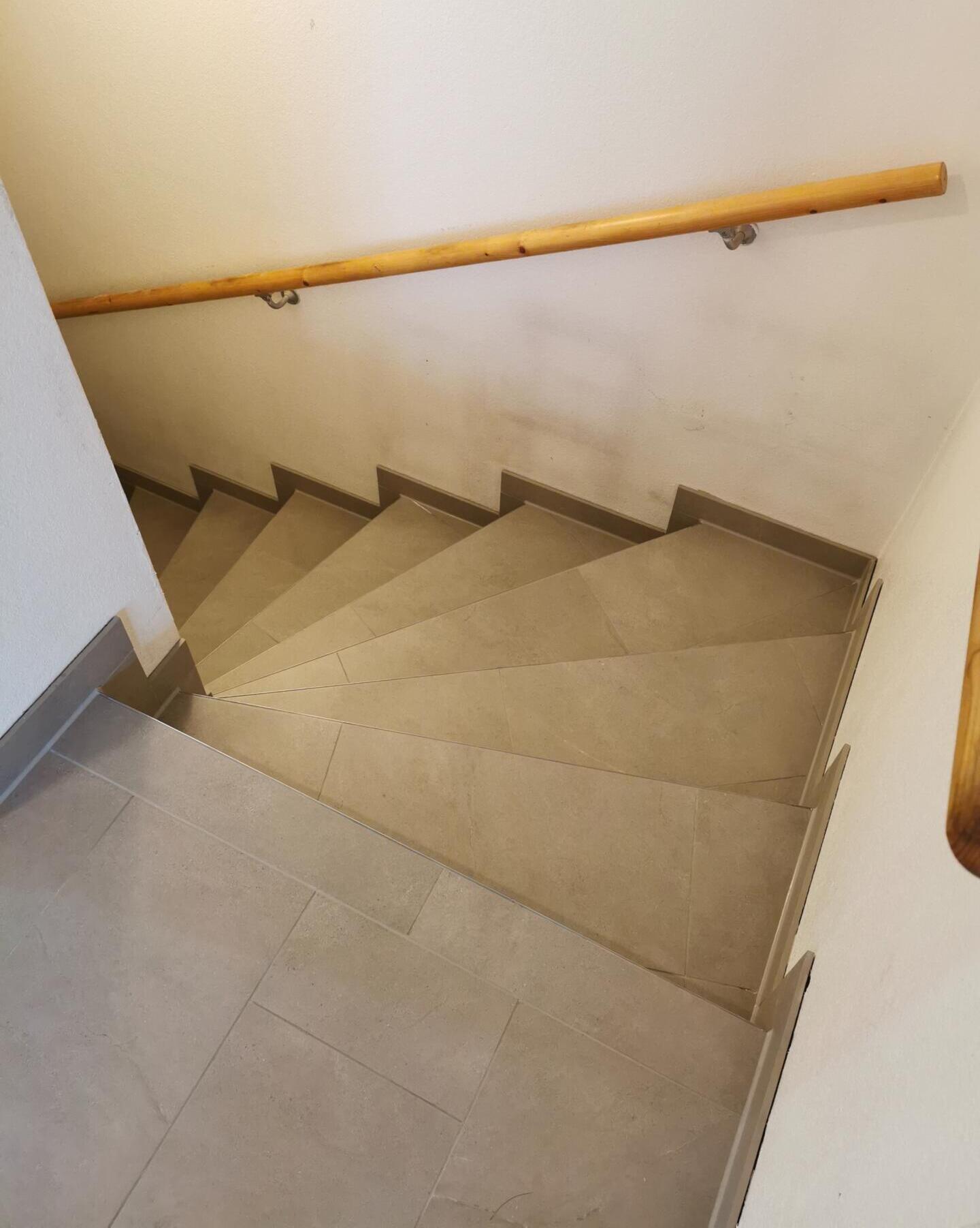 Sanierung der Fliesen Beläge aus den 70er. Die Treppenläufe erstrecken sich auf 3 Etagen und gehen nahtlos in Küche Flur über. Zum Schützen der Fliesen Kanten, verbauten wir Edelstahlschienen als Winkelprofil. Dadurch schützen wir die Kanten gegen Beschädigungen und haben eine leichte optische Abgrenzung von dem Fliesenbelag zur Trittsicherheit.