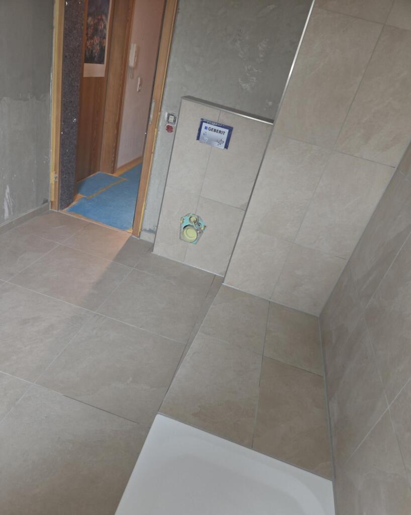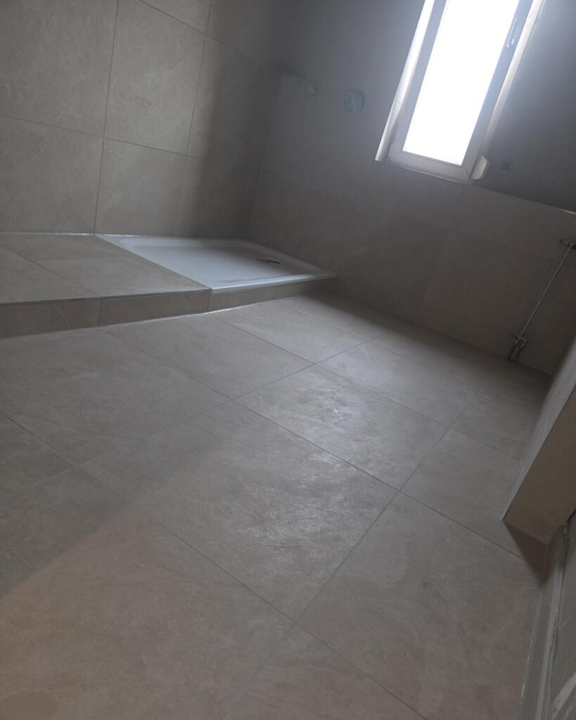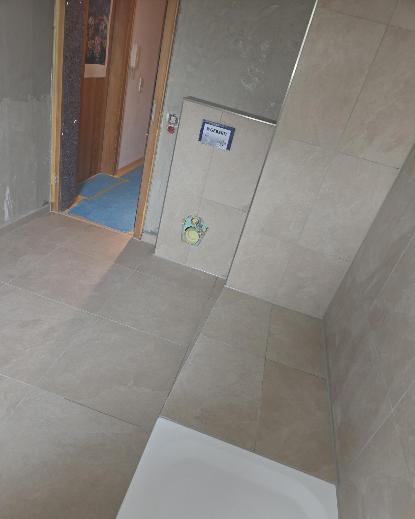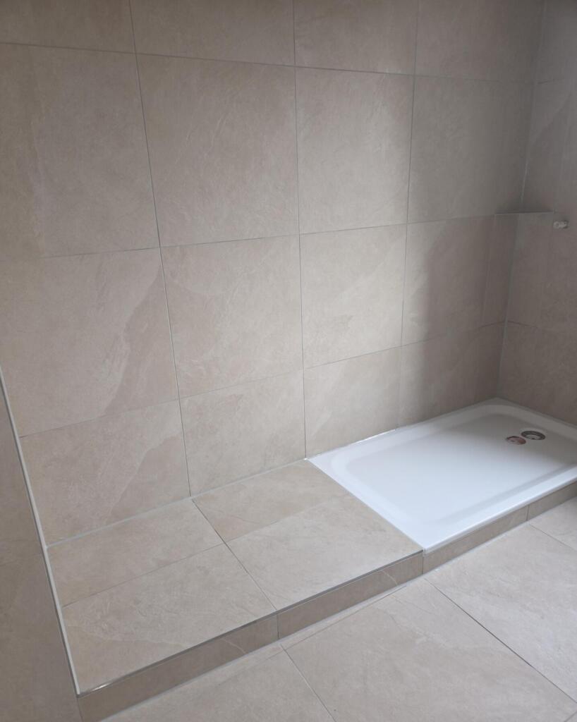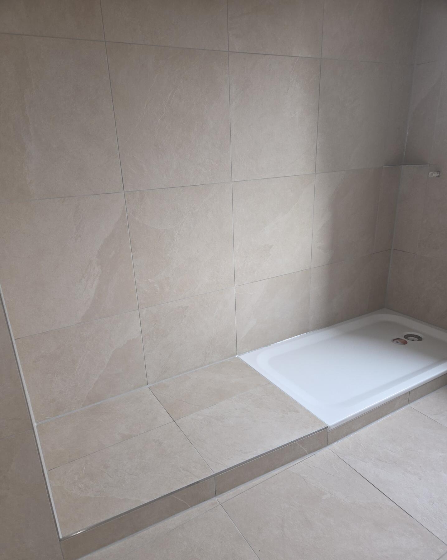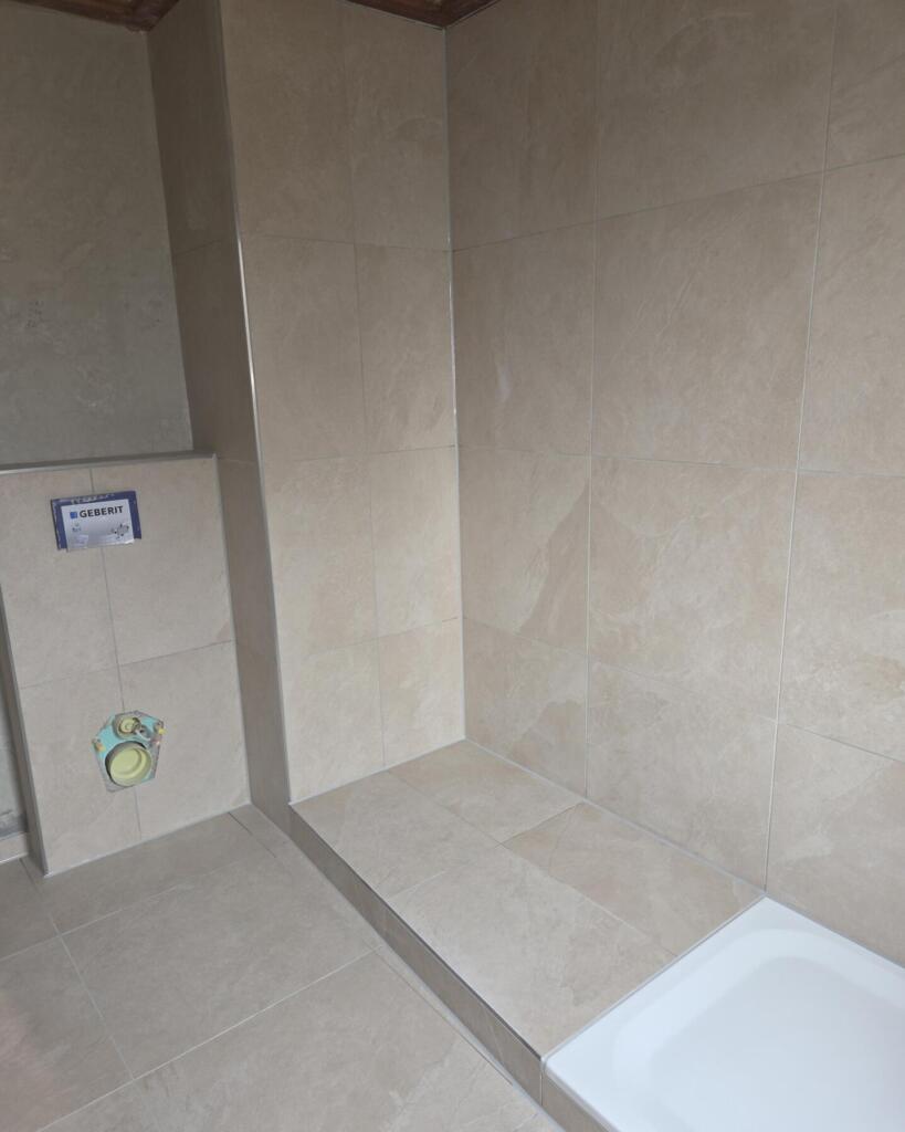 Großformatfliesen Caesar Slab2 Khaki in 60x60 mit dezent erhabener Schiefer Struktur. Edelstahl Ecke als Ablage für Duschutensilien. Profilschienen in Edelstahl gebürstet.